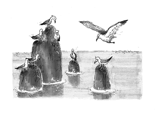 Le mois de mars celui du printemps, il y a une idée de combat avec mars. J’ai imaginé cette scène de mouettes qui scrutent toutes au même endroit, peut-être un met appétissant à manger ?