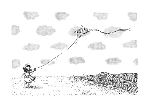 évidence ici / avec ce petit vent frais qui fait voler le cerf-volant, passer les nuages comme un motif parfait, les vagues, la fillette est tout en mouvement aussi.