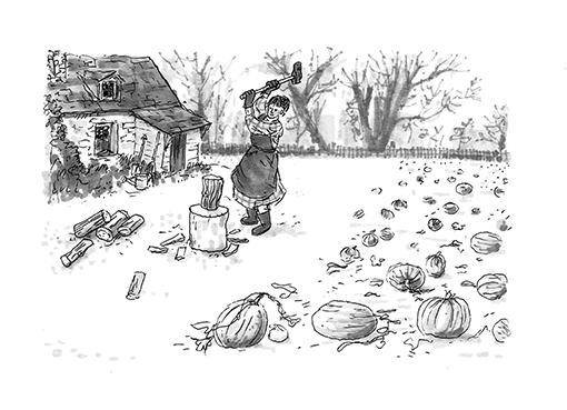 Il y a un goût de mystère assez obscure en octobre. J’ai imaginé cette scène d’une femme forte qui coupe son bois à la hache pour (je me raconte) sa bonne soupe du soir. Avec son champs de citrouille qui ici symbolise aussi l’abondance, la gratitude. L’image peut aussi faire penser aux notions de transformation et libération par l’autonomie de cette femme qui moi m’inspire.