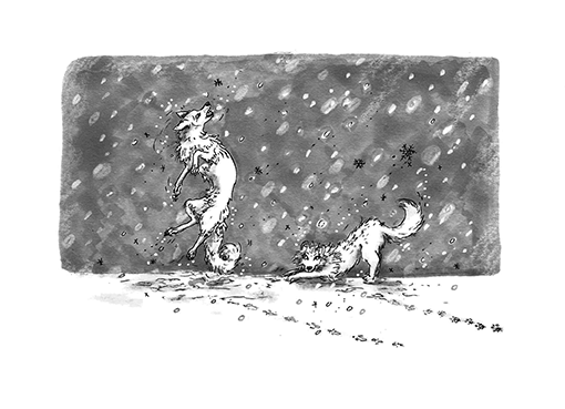 Dernier mois, celui associé au partage, aux festivités, à la joie… même si on l’oublie parfois dans notre société consommatrice. Une recherche d’équilibre d’ailleurs là encore. Le loup est aussi un animal du mois de décembre, il me fascine et j’ai eu envie de le dessiner qui saute pour jouer avec la neige.