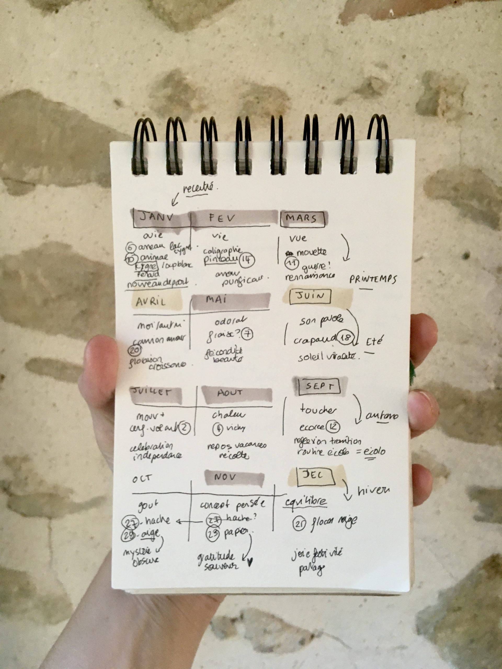 J’ai associé ces mots aux douze mois de l’année en cherchant des associations d’idées, des correspondances avec des concepts, à certains animaux, à la saison, aux activités etc…