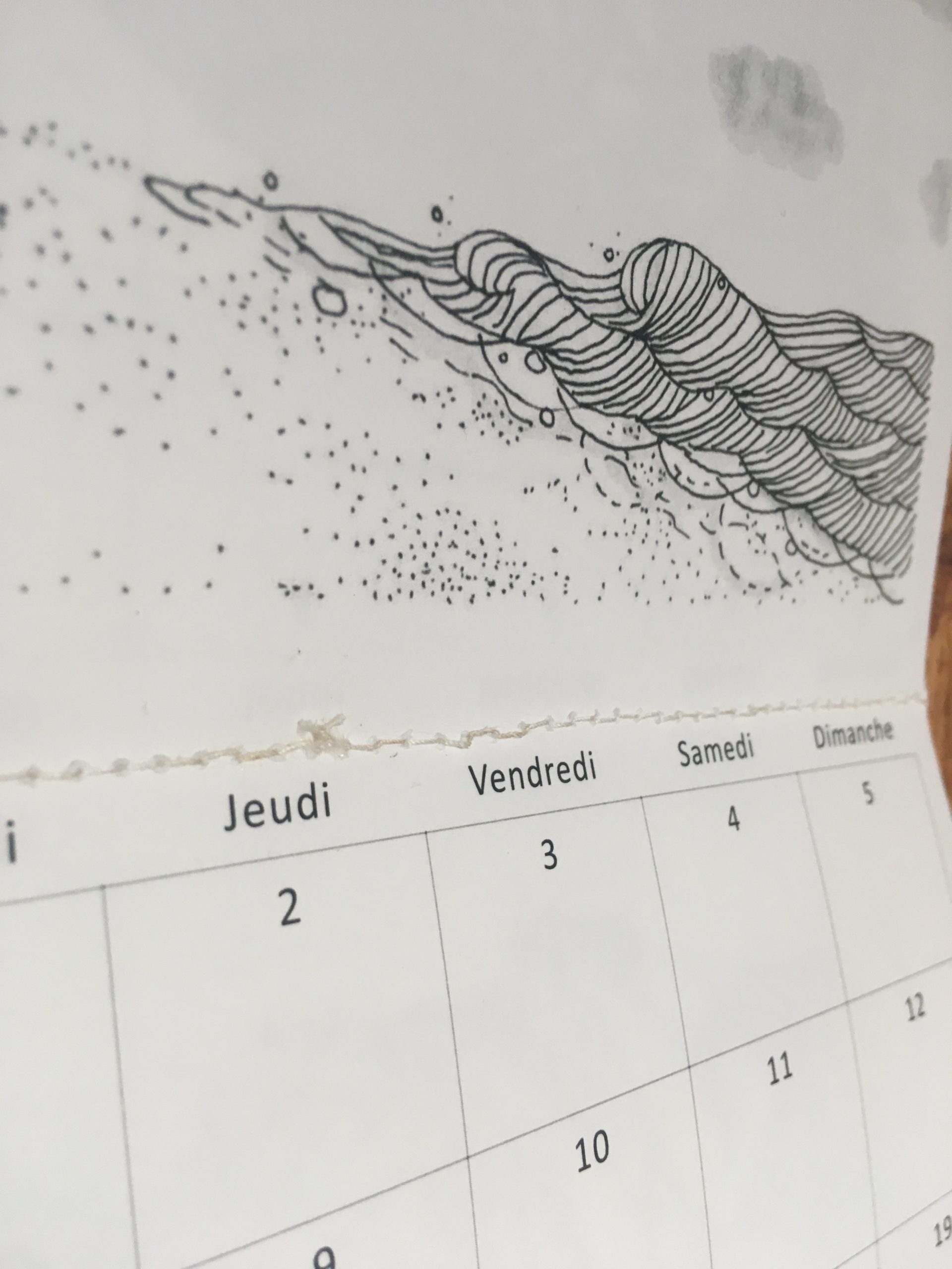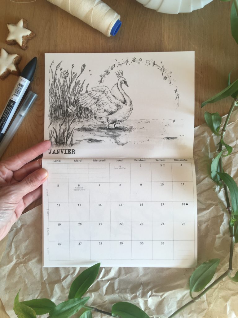 J’ai proposé au verso du calendrier de deviner les associations que j’ai choisi : chaque mois est associé à un mot et un sens pour créer le dessin original.