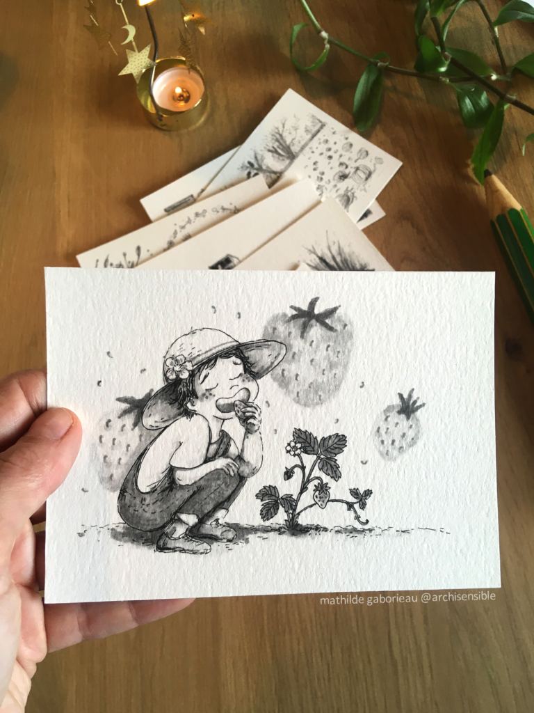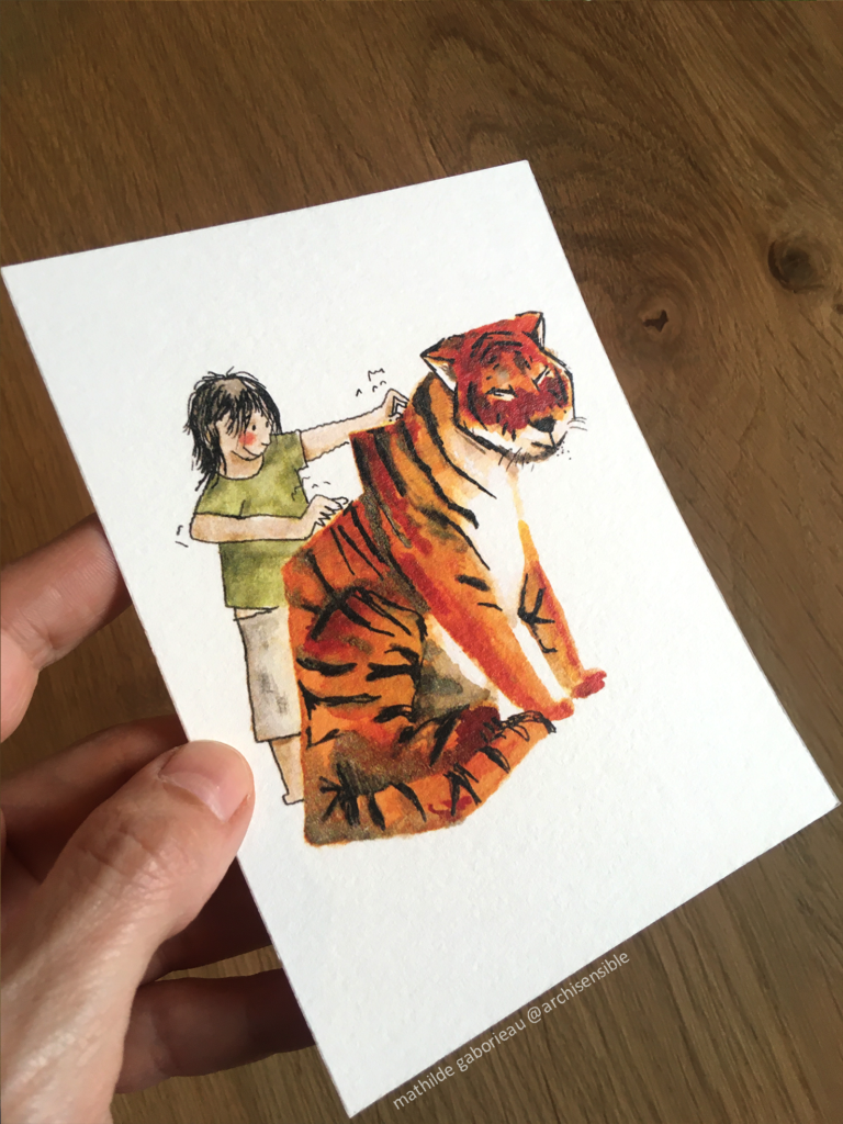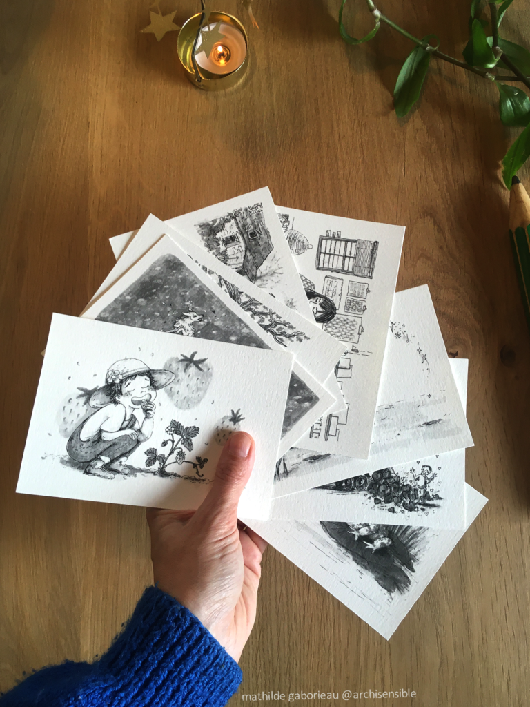 J’y propose selon le contexte : un échantillon de mes dessins reproduits sur du beau papier aquarelle, des calendriers, l’éventail des émotions, des linogravures, des stickers, et même des originaux …